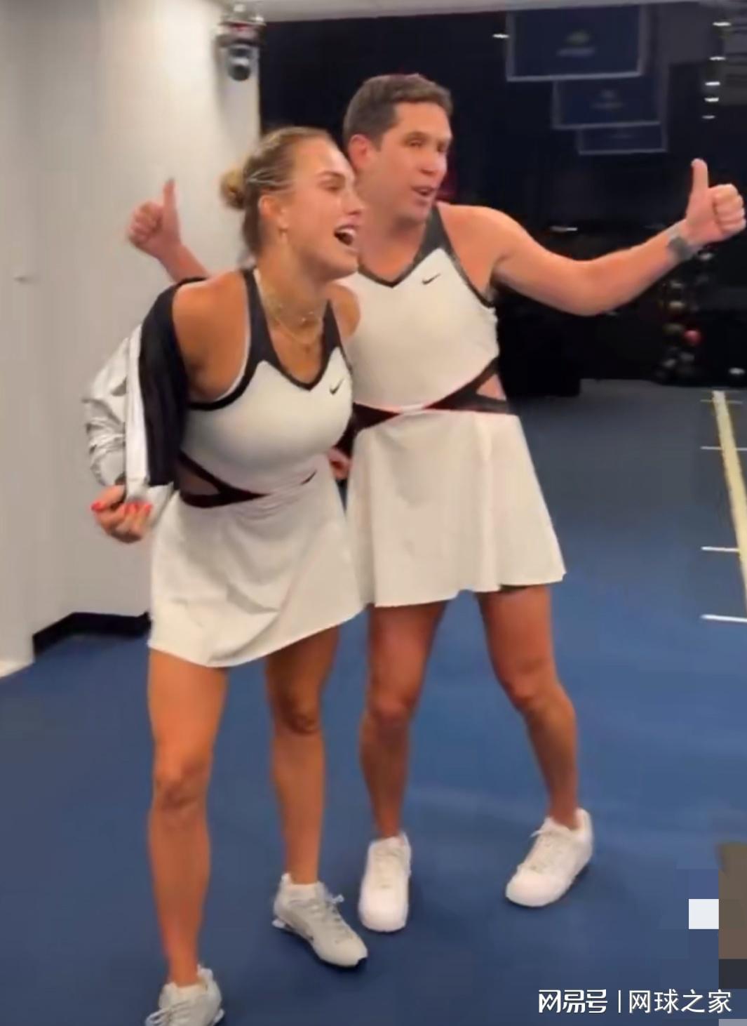 私底下和团队一起庆祝时,萨巴伦卡更是放出了一个超级大招。直接让自己的团队男成员穿上自己的美网战袍扮自己,那画风的劲爆程度,很多人将之形容为,“隔着屏幕都想疯狂尖叫,太会玩,也太敢玩了。”