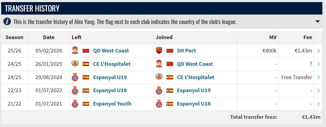 杨希是目前冬窗本土球员引援的标王,也是目前中超冬窗转会费第二高(仅次于申花外援拉唐的200万欧元)的球员。